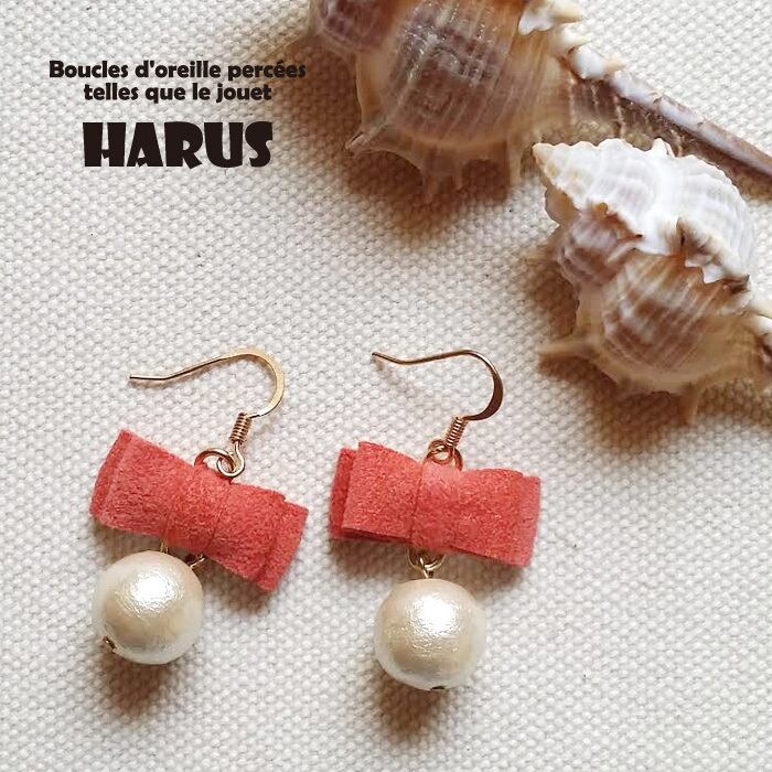 サーモンピンクのスエードリボンにコットンパールを…♡