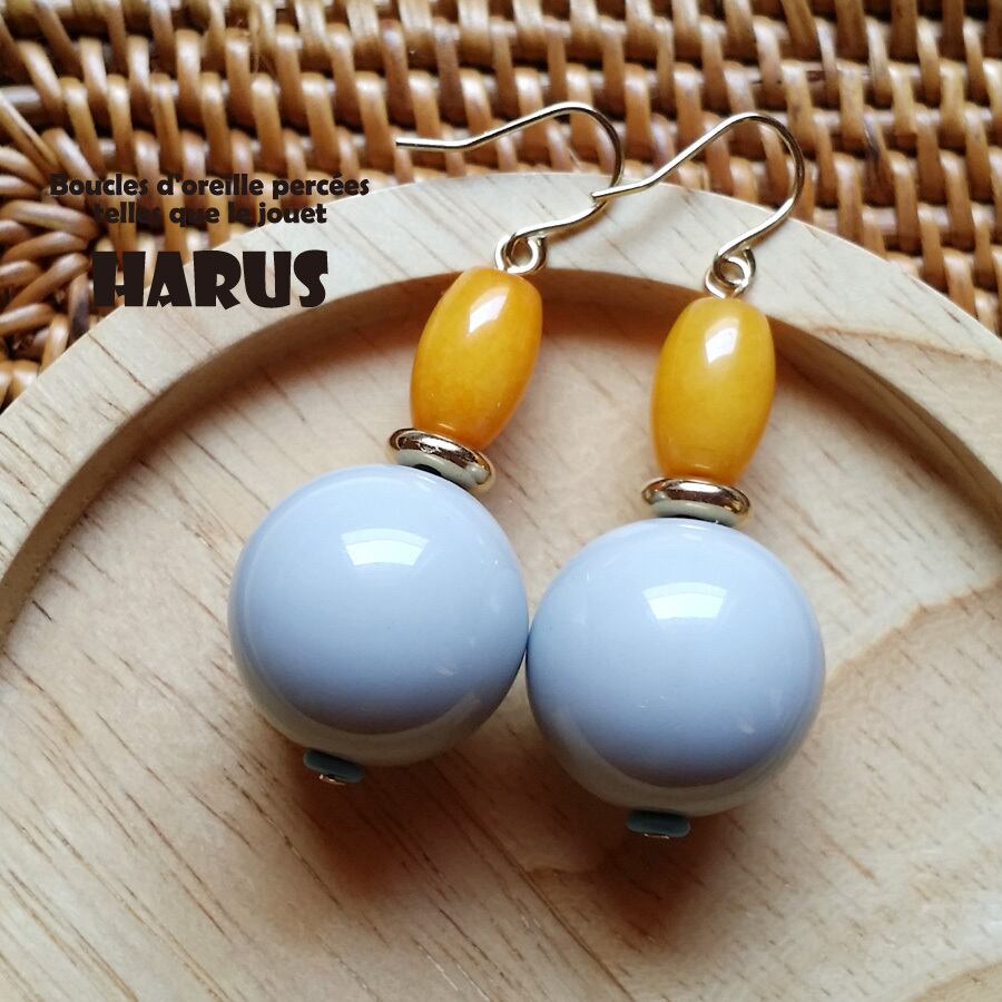 淡いグレーのまんまるビーズに、フランス製の黄色いビーズ♪